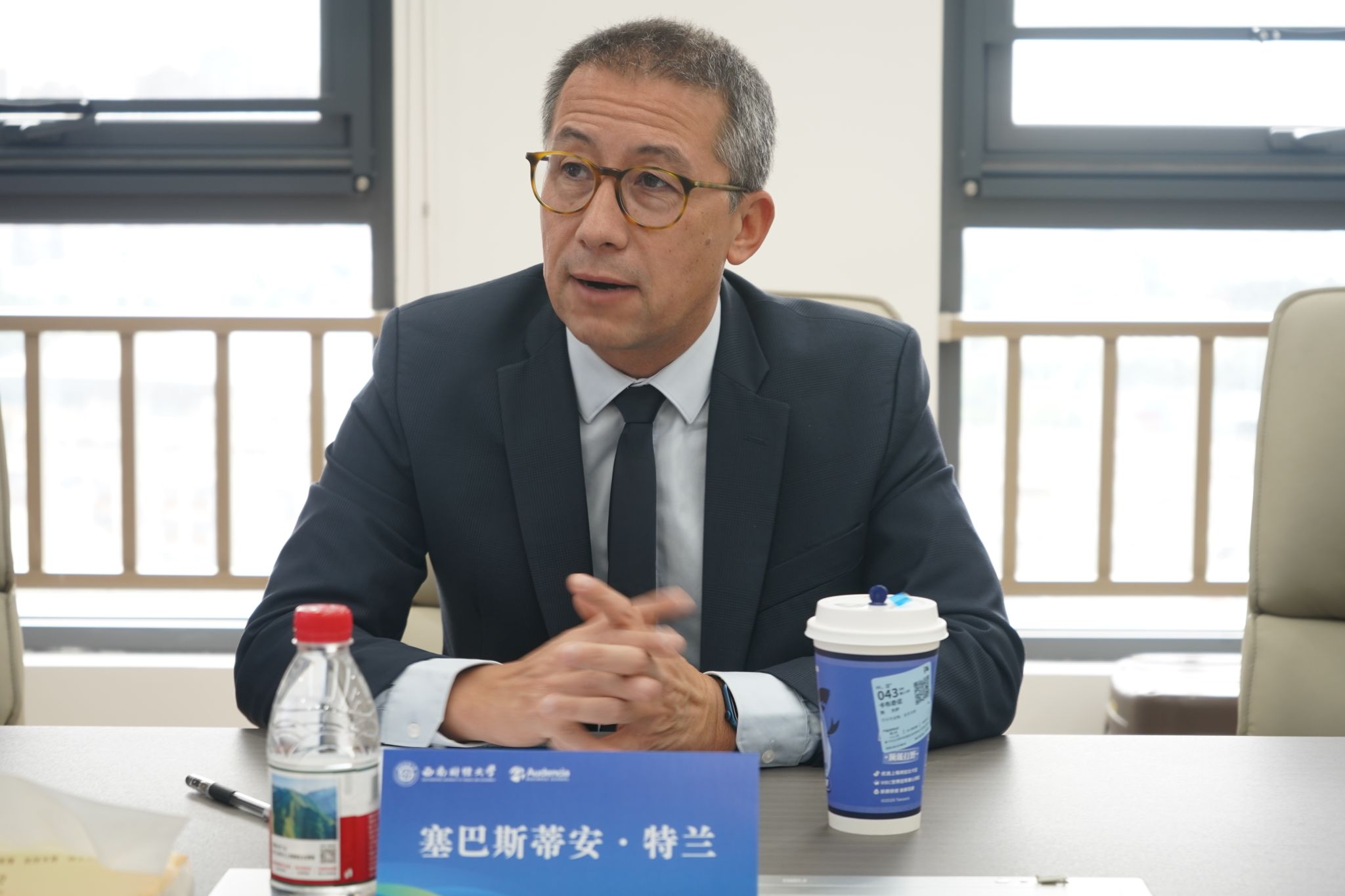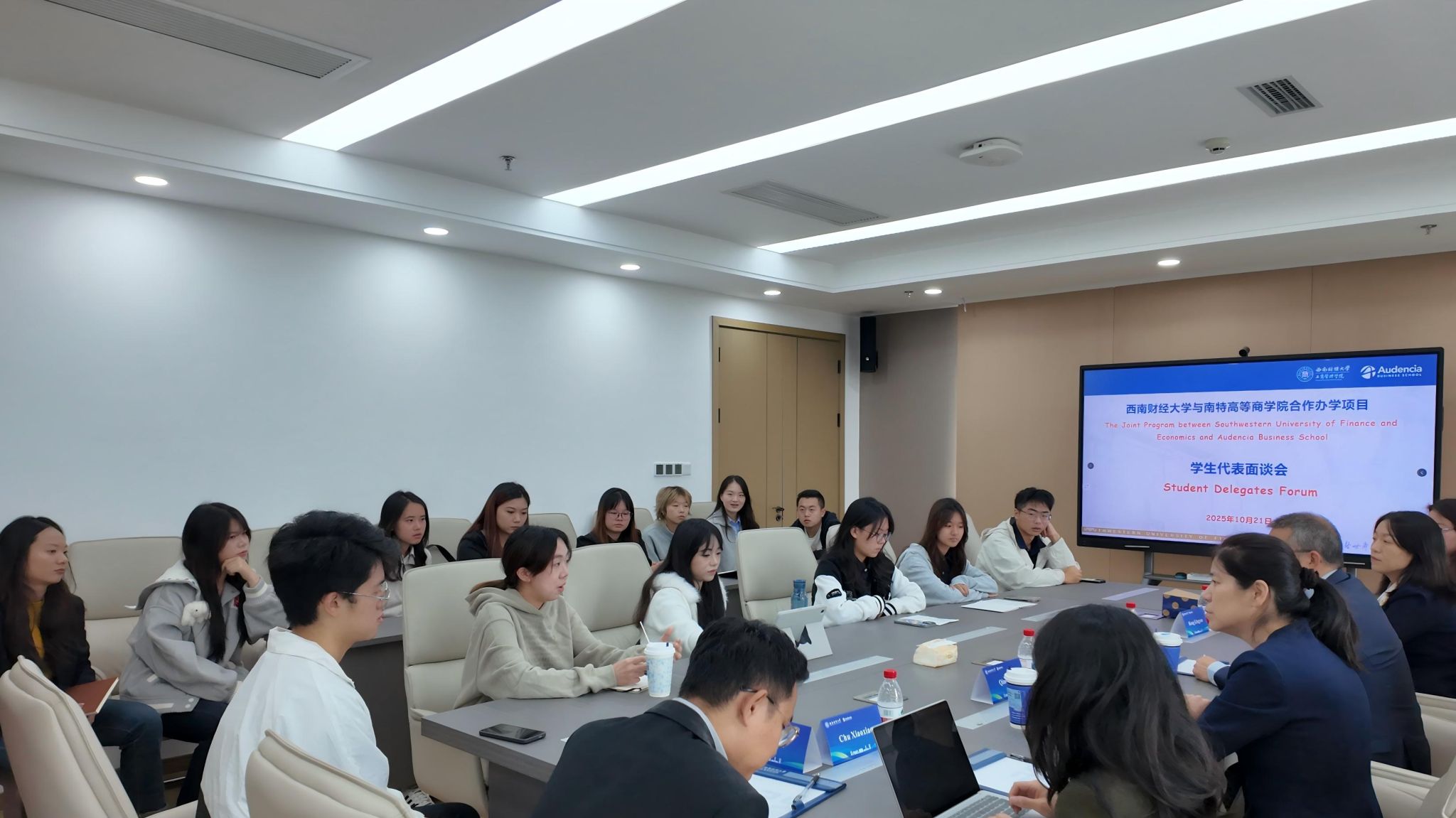 10 月 21 日上午,为进一步把握学生需求,切实提升西财-南特合作办学项目服务质量,南特高等商学院院长塞巴斯蒂安·特兰(Sébastien Tran)和西财-南特项目的 20 余名学生代表在西南财经大学工商管理学院诚正楼1241会议室开展面对面交流。南特高等商学院亚洲职业与企业关系主任乔俊女士,学院党委办公室主任储潇潇老师、西财-南特项目办公室王宇老师和汪鑫波老师全程陪同,为学生补充解答疑问。双方围绕海外升学、核心能力培养、专业认知及未来发展等议题展开深入对话。