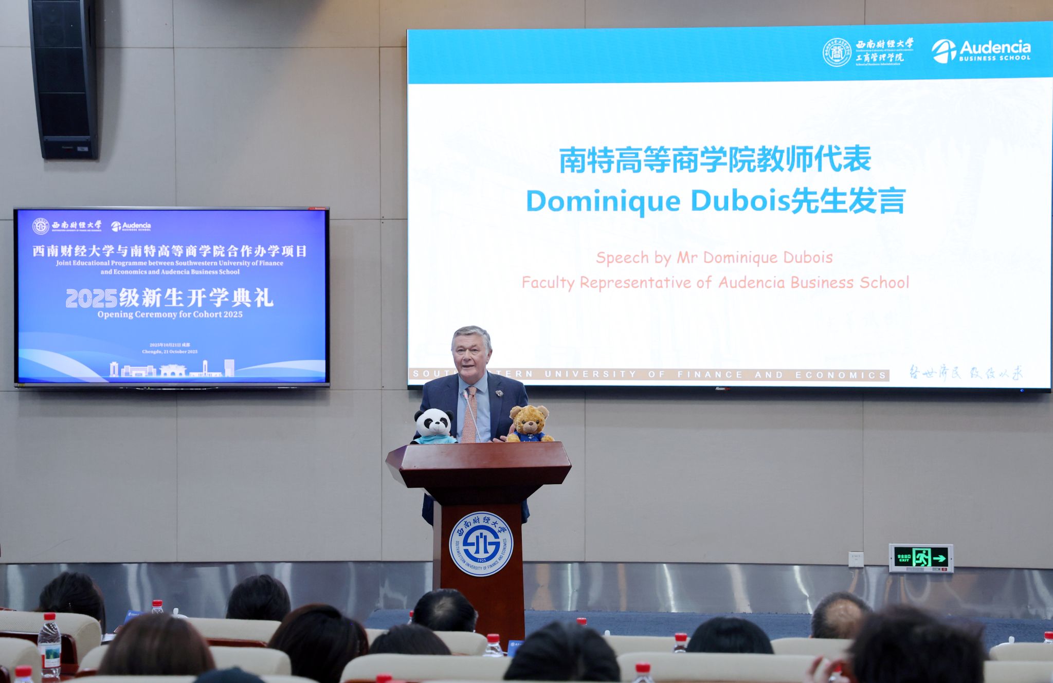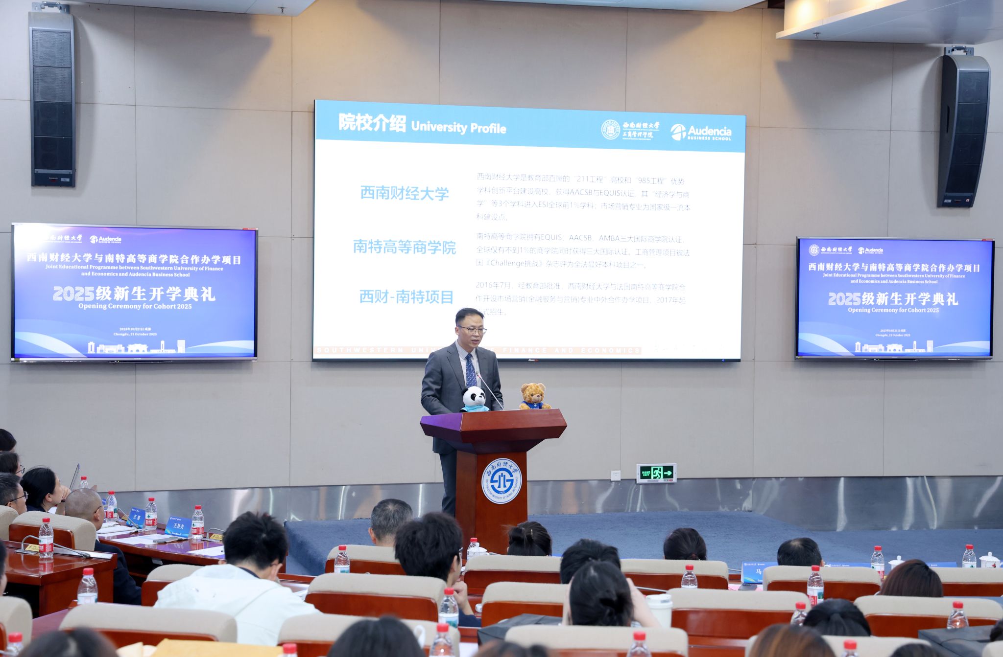 10月21日,西南财经大学与南特高等商学院合作办学项目2025级新生开学典礼在弘远楼101会议室隆重举行。法国南特高等商学院院长塞巴斯蒂安·特兰(Sébastien Tran),南特高等商学院亚洲职业与企业关系主任乔俊,党委常委、副校长马永强,国际交流与合作处处长王偞婷,学生工作部副部长牟方志,工商管理学院党委书记郑茂,院长李涵,党委副书记、纪委书记胡国平,党委副书记王昱夫,副院长廖毅与授课教师代表、项目管理团队以及2025级项目全体新生齐聚一堂,共同见证这一重要时刻。