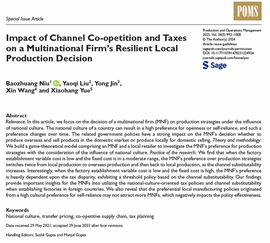 我院王鑫教授以共同一作身份合作的论文“Impact of Channel Co-opetition and Taxes on a Multinational Firm’s Resilient Local Production Decision”在UTD24运营管理领域权威期刊Production and Operations Management 发表,论文合作者为华南理工大学牛保庄教授、法国蒙彼利埃高等商学院刘窅祺副教授、香港理工大学金涌教授和美国威斯康星大学密尔沃基分校岳晓航教授。