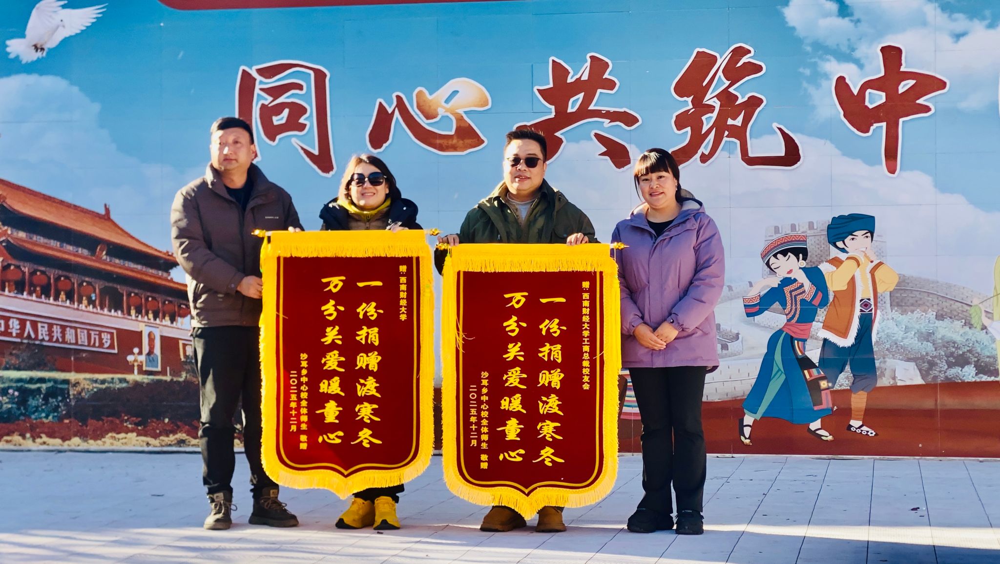 活动中,沙耳乡中心校校长严应康代表全校师生接受捐赠并致谢。他表示,本次所受赠的空调、文体用品等物资,有效改善了学校冬季学习环境,丰富了学生课余生活,不仅解决了实际困难,更传递了温暖与鼓励。工商管理学院EDP中心主任郑红霞表示,学校始终秉持经世济民担当,本次捐赠是学院及校友会践行社会责任、聚焦教育帮扶的切实举措,未来将持续关注并支持乡村教育发展。活动最后,校方向捐赠方赠送锦旗以示感谢。