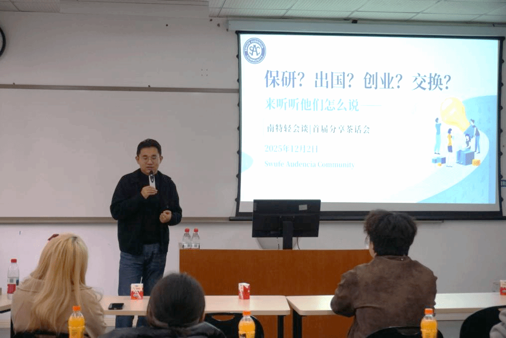 2025年12月2日下午,西南财经大学与南特高等商学院合作办学项目首期“南特轻会谈”系列活动分享会在西南财经大学柳林校区格致楼J203顺利举行。此次活动围绕“保研·出国·创业·交换”主题展开,旨在通过朋辈间的经验分享与深度交流,为项目学子打造一个开放多元的交流平台,助力同学们探索发展方向,构建同行者网络,项目负责教师和各年级学生代表30余人共同参加活动。