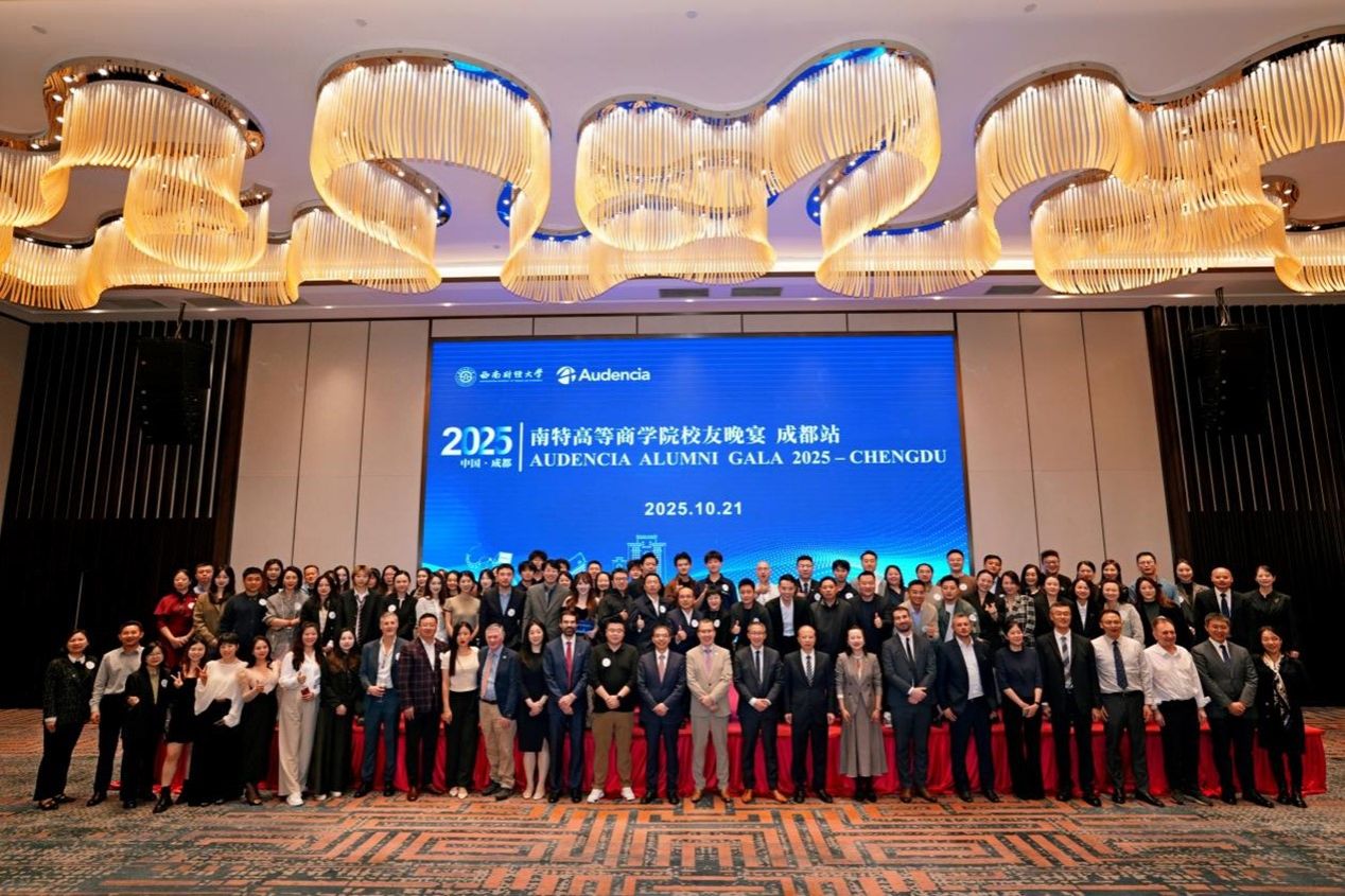 项目高度重视校友共同体建设,于2025年10月和12月分别举办了校友晚宴与主题跨年晚会。在10月于成都举行的校友晚宴上,法国驻成都总领事戴宁智先生、西南财经大学校长李永强教授、法国南特高等商学院校长塞巴斯蒂安·特兰教授等嘉宾亲临致辞,共同回顾合作丰硕成果,展望未来发展蓝图。成都校友会会长龚宇先生现场宣布了启动“三星堆文化当代艺术展”赴法展览及组织校友赴法深度考察两项重要计划。随后在12月末的跨年晚会上,近百名校友再度欢聚,在表演、晚宴与互动游戏中深化情谊。两场盛会强化了情感纽带,将校友网络升级为持续赋能、共创机遇的活力平台。